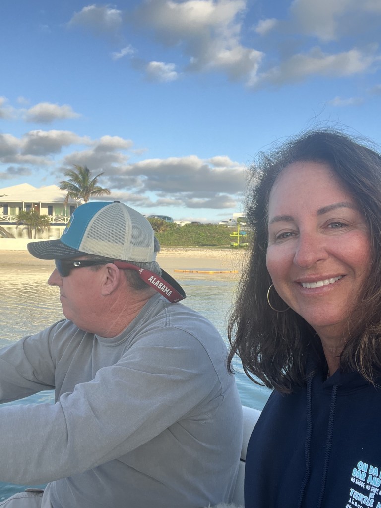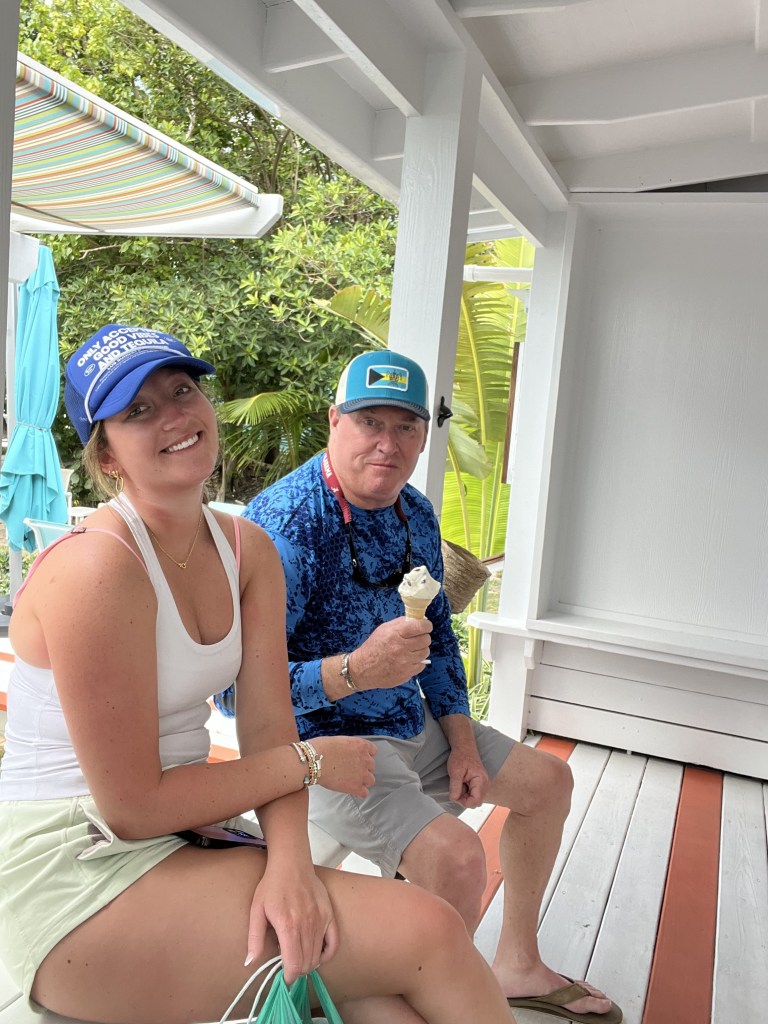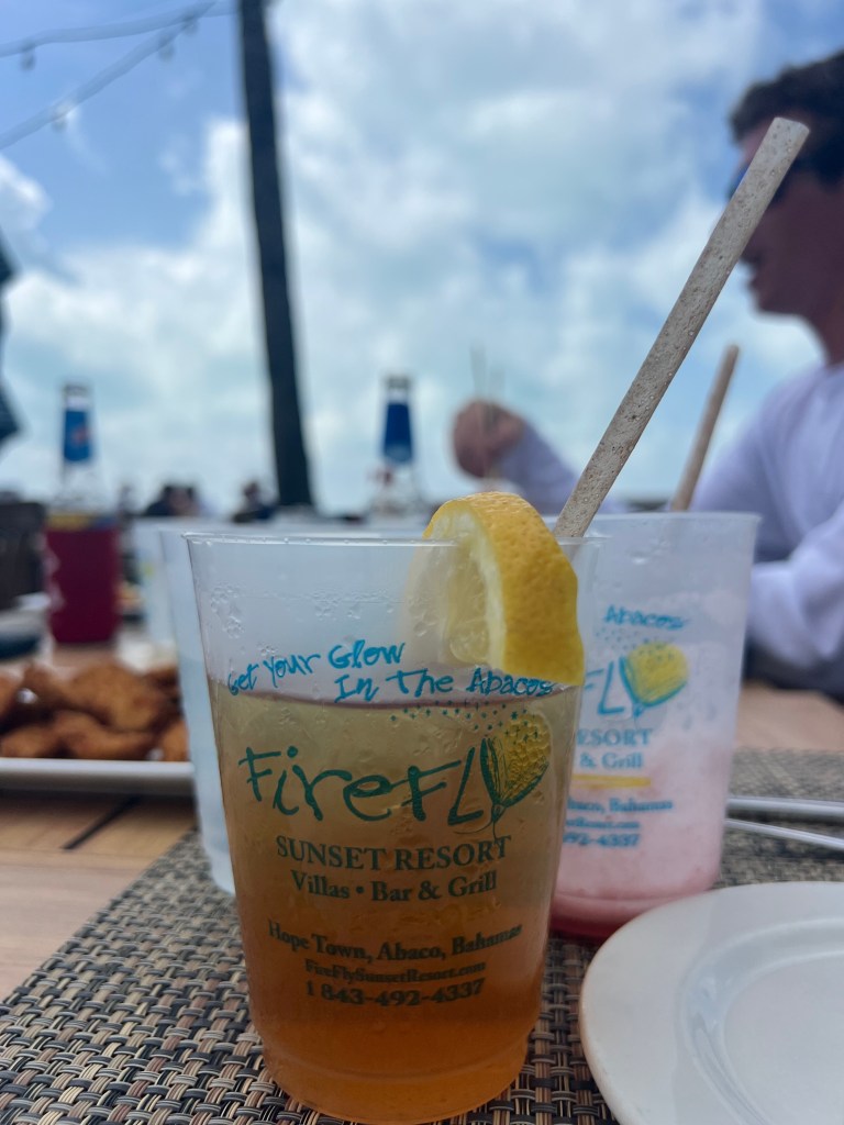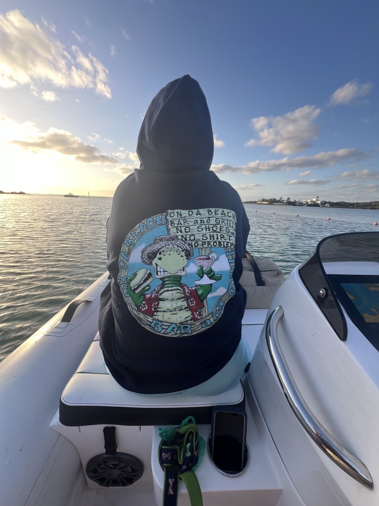 Tuesday, March 12, 2024. – We started today with the most important meal of the day. Family breakfast at Abaco Inn Restaurant. Excellent food and service. Most importantly- coffee is delicious and the view is picture perfect. Parker and Ryan went catching while Phil, Morgan, Teddy and I went into Hope Town to do a little t-shirt & souvenirs shopping.
