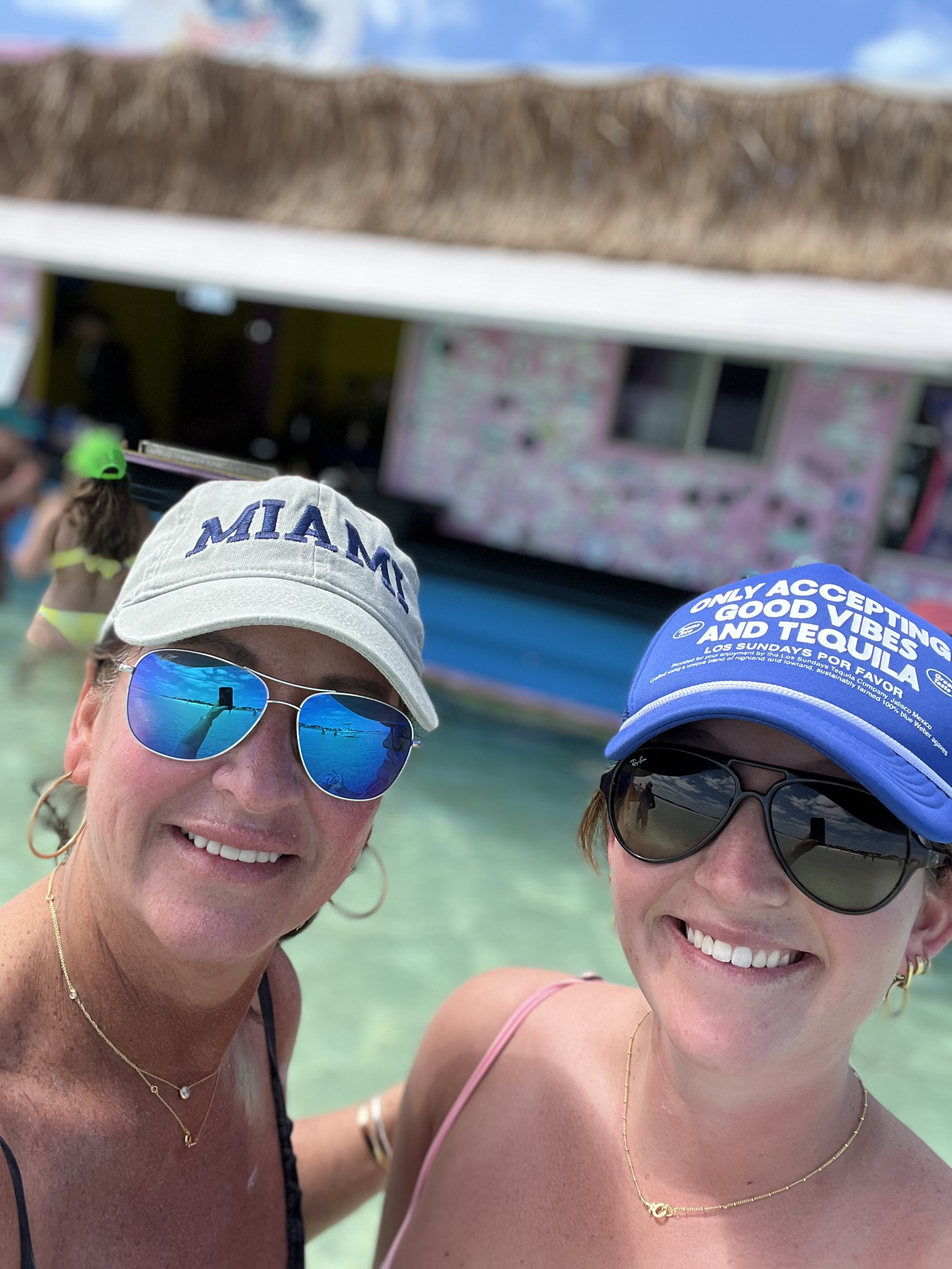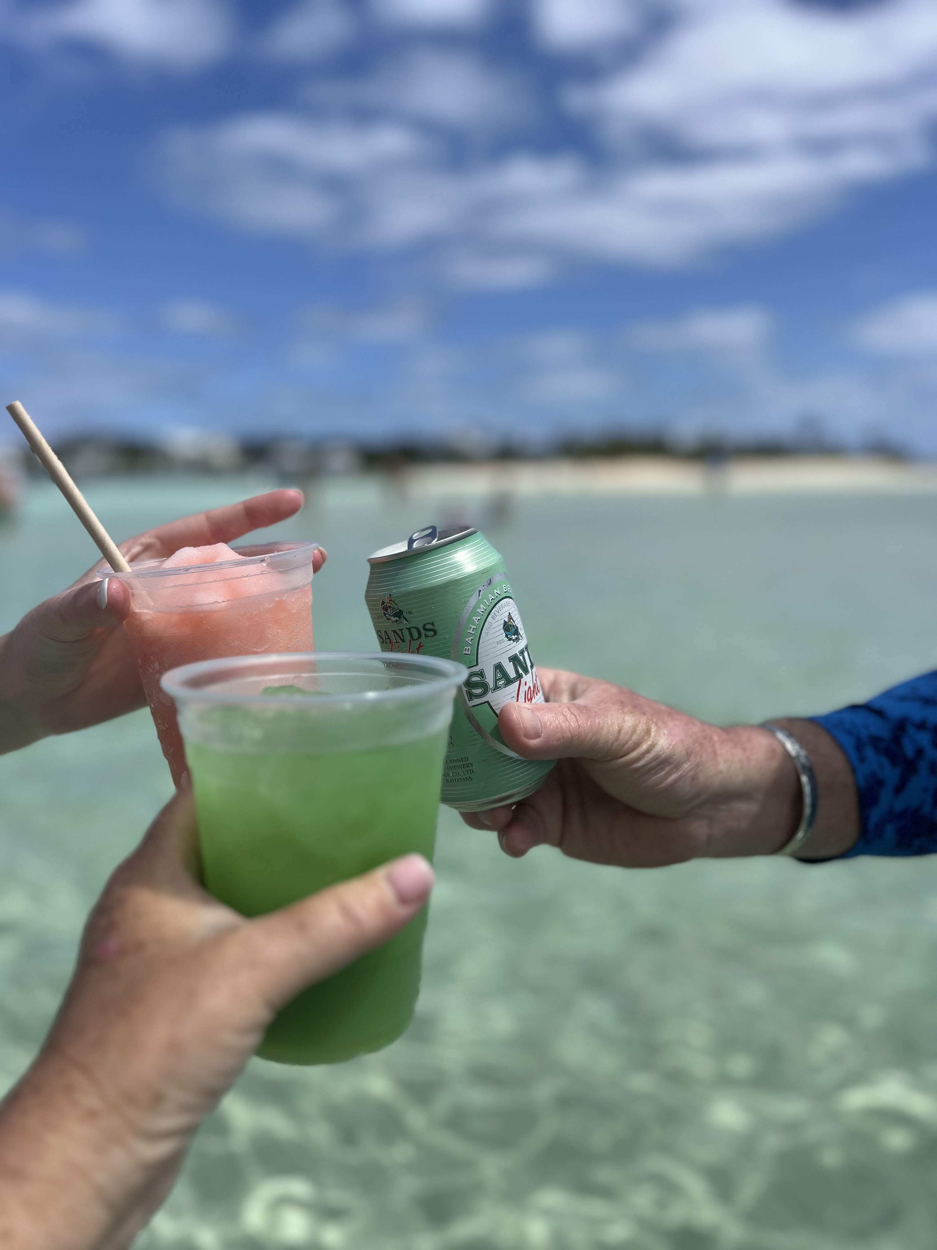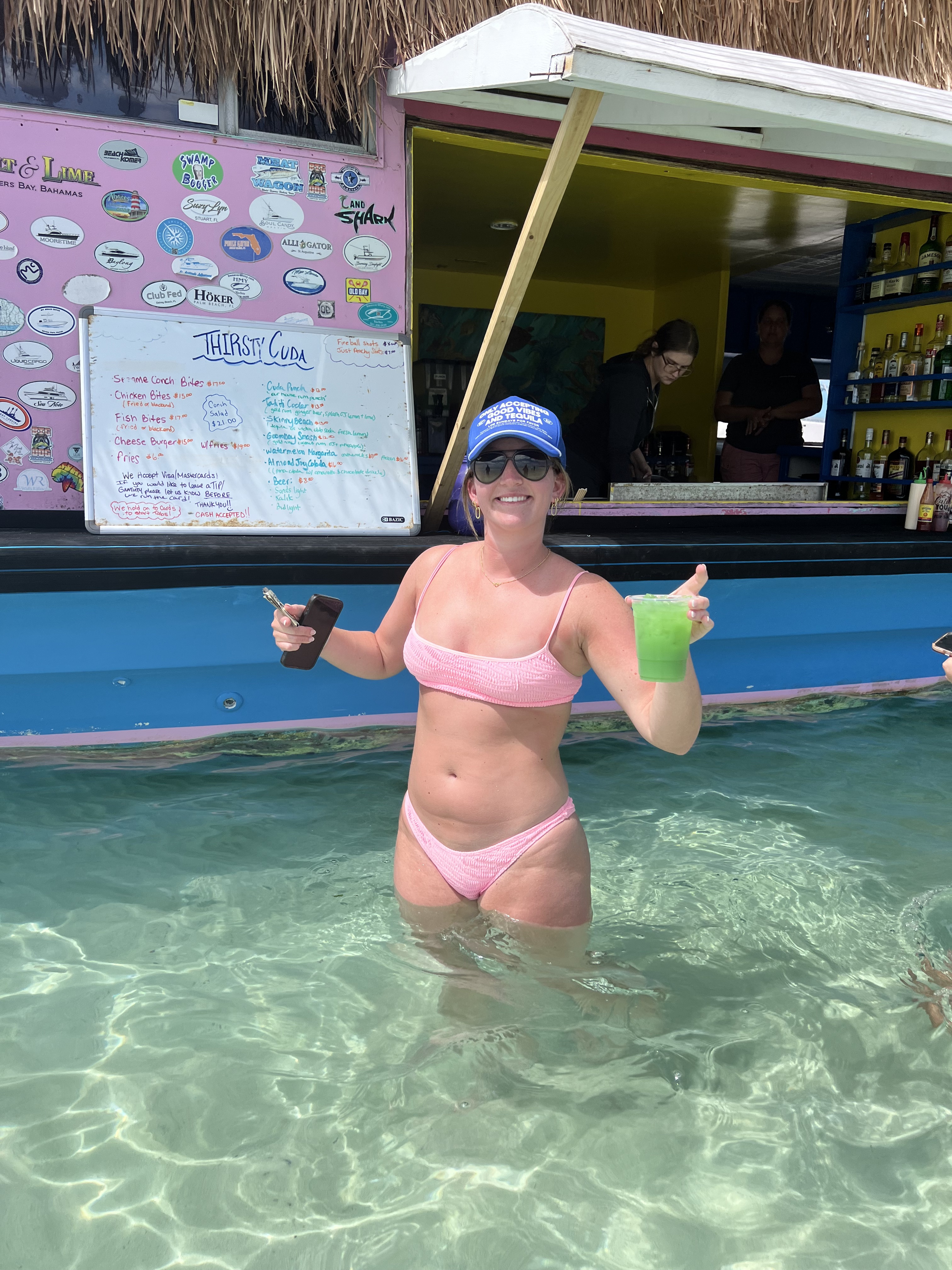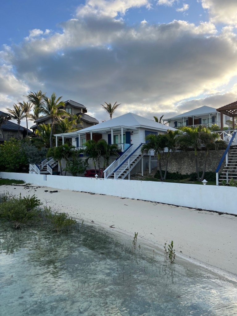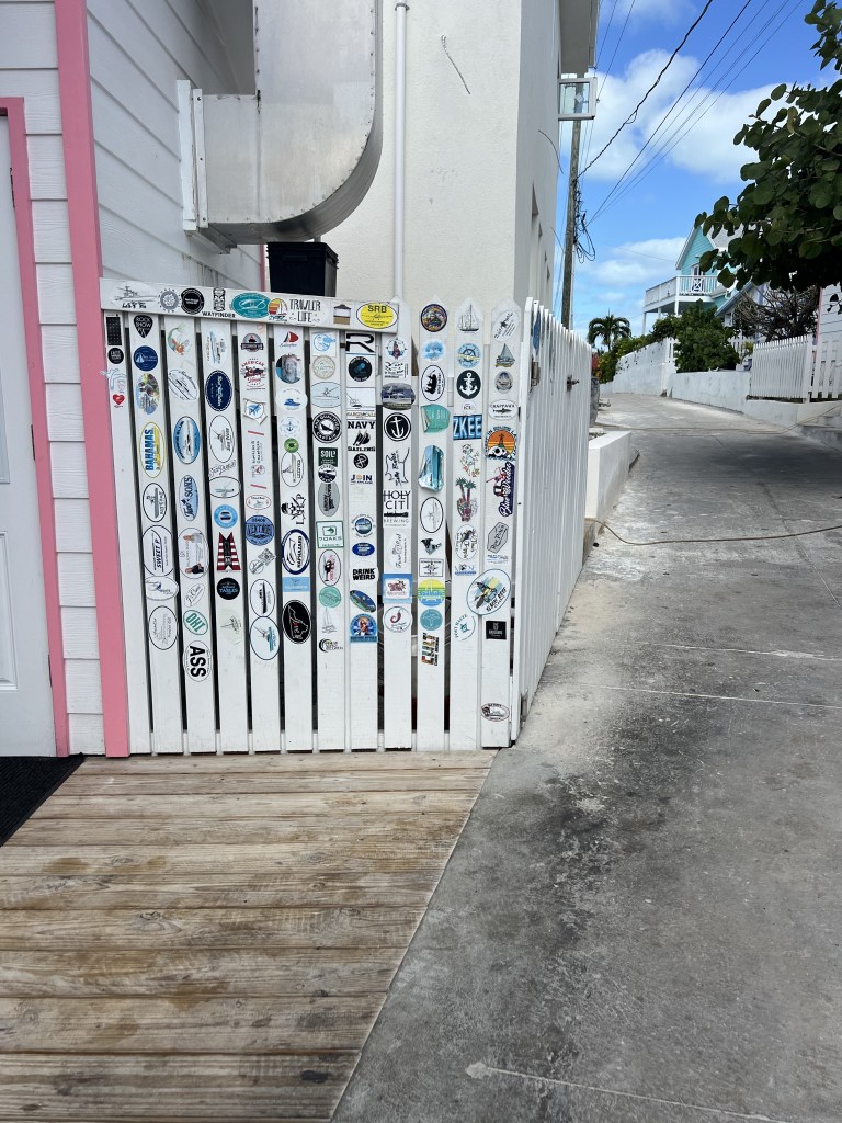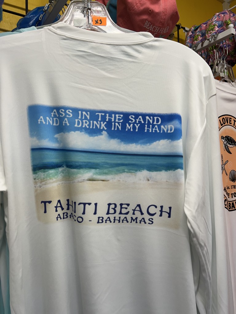 Soon after the shopping trip into Hope Town – we couldn’t get back fast enough to pack up the golf cart with beach chairs, a cooler and sunscreen – off we went to spent the afternoon at the infamous ” Tahiti Beach” – this beautiful , secluded white sand beach that anyone can get to from either a boat, golf cart, bikes, or walking. It’s the perfect spot to put a chair in the sand and read a book. Or walk along the water line and collect shells or sand dollars. It really is one spectacular beach. Also at Tahiti Beach is “The Thirsty Cuda” – It’s a great swim-up bar and restaurant. It goes without saying, when on Elbow Cay a visit to Tahiti Beach is a must- Walking through the clear water to a floating bar is a definite must. SO MUCH FUN. COOL VIBE AND EXCELLENT MUSIC. Can’t wait to do it again tomorrow.